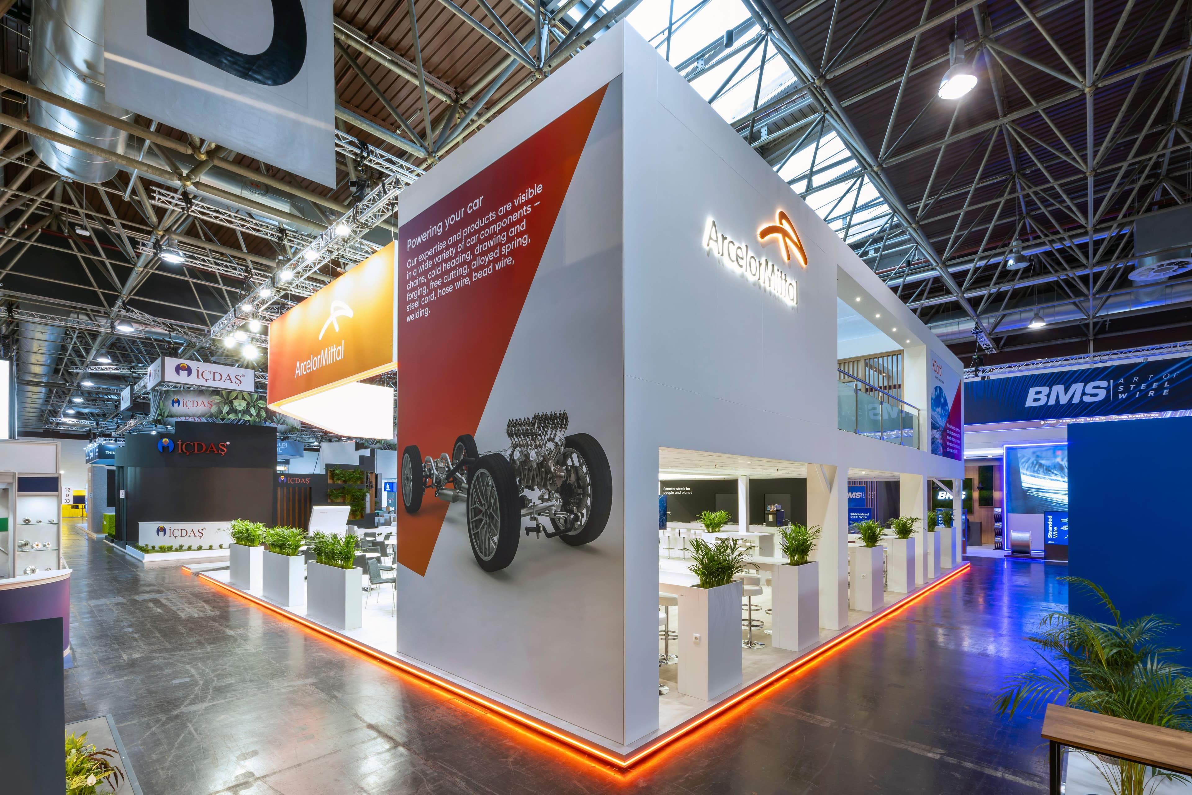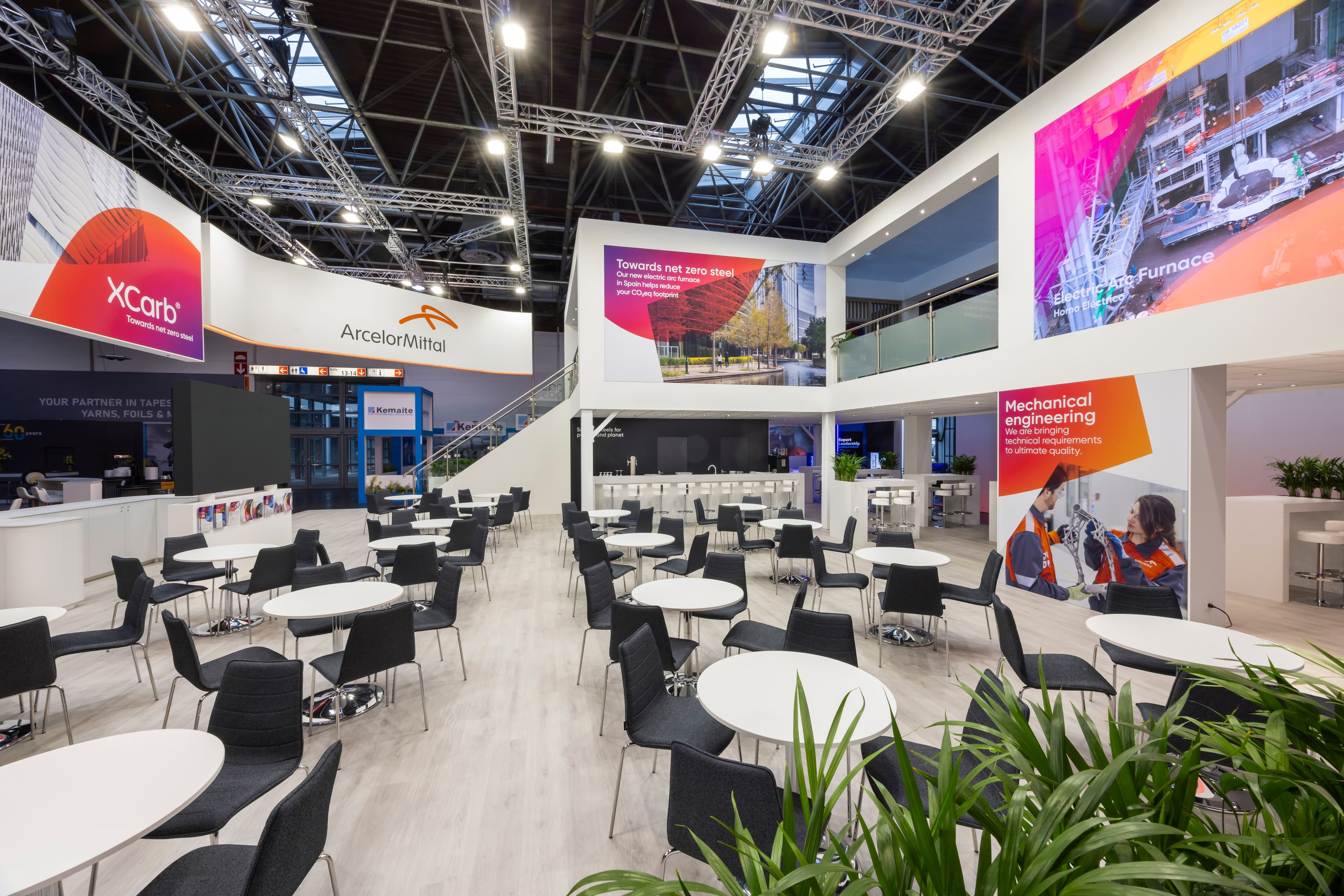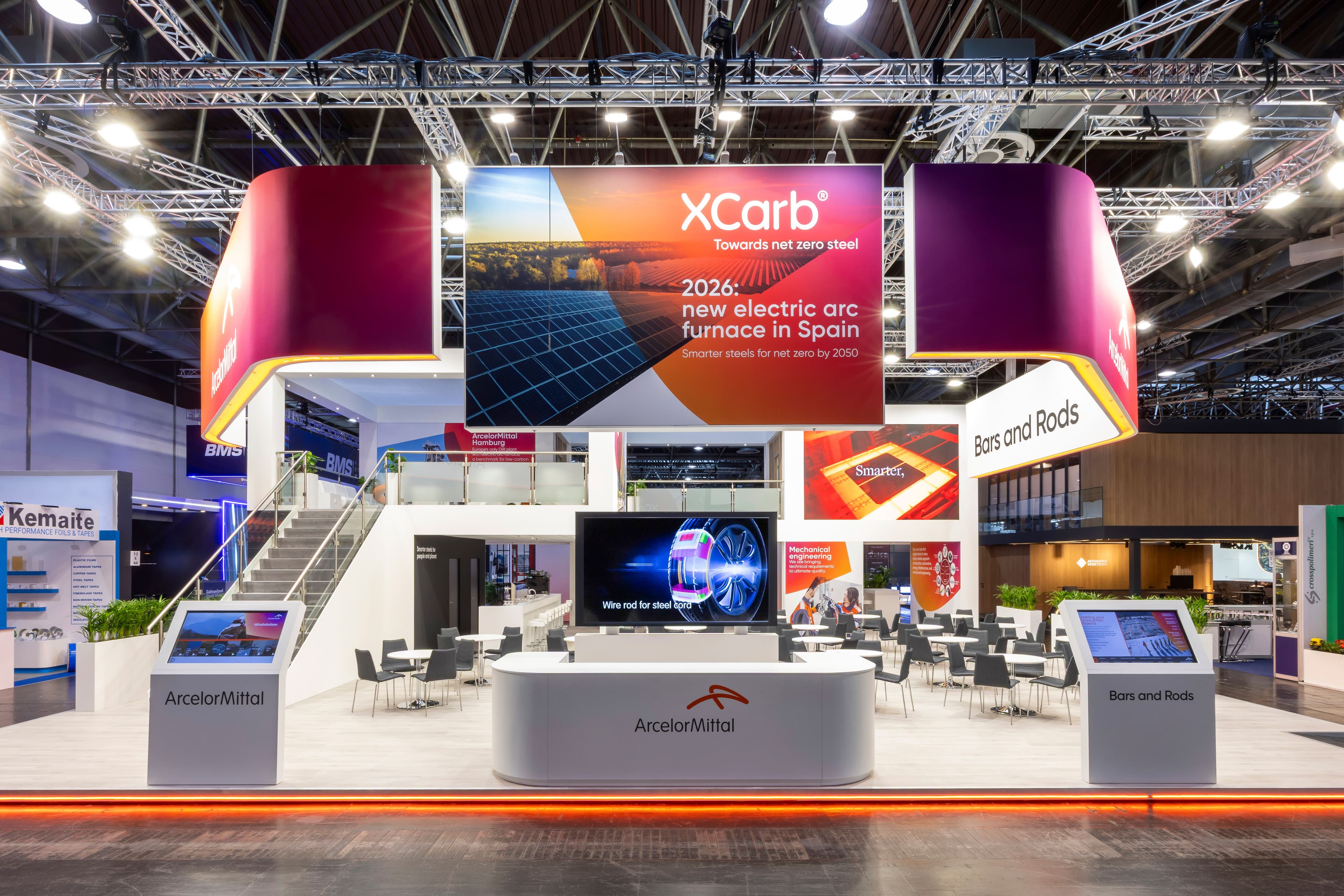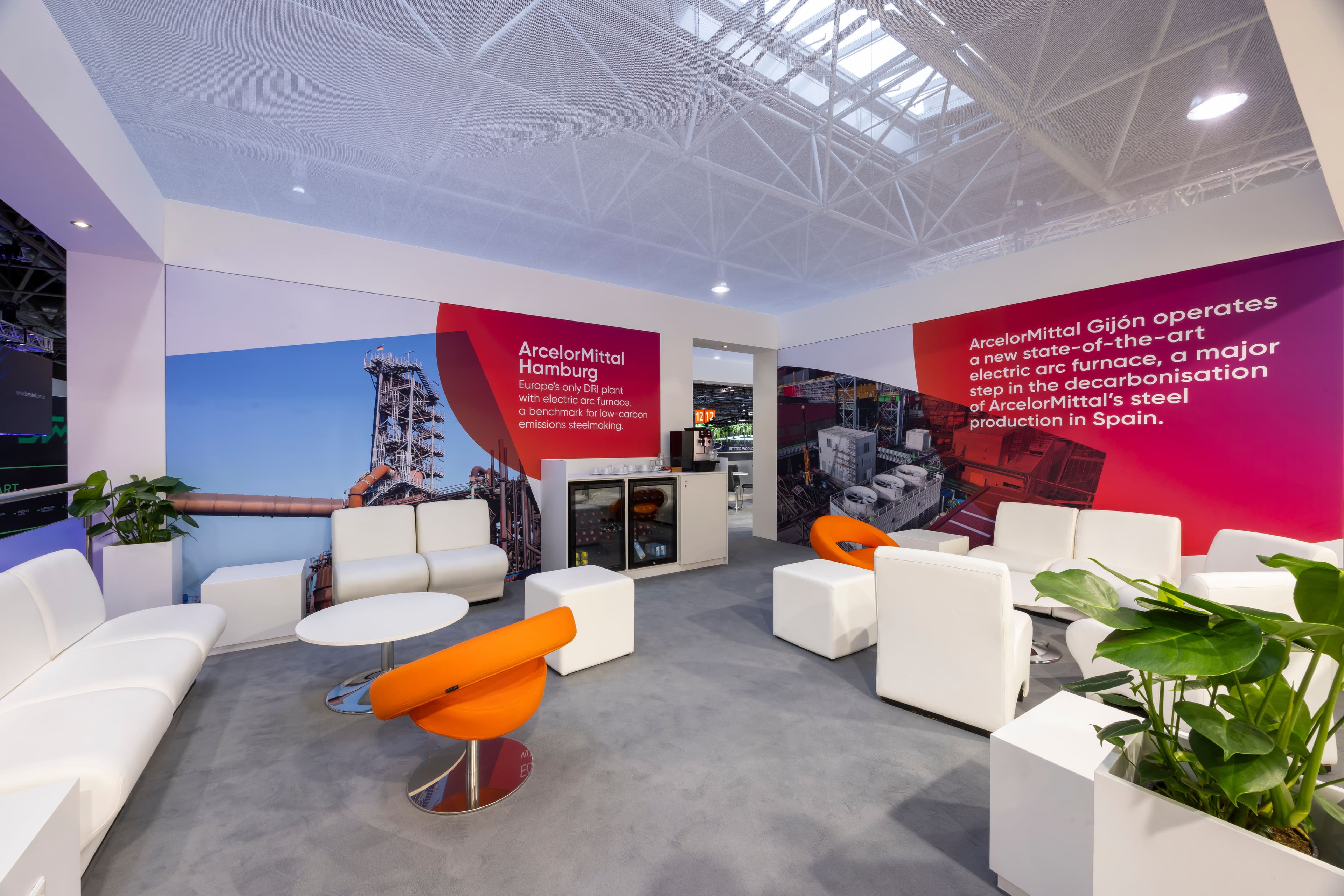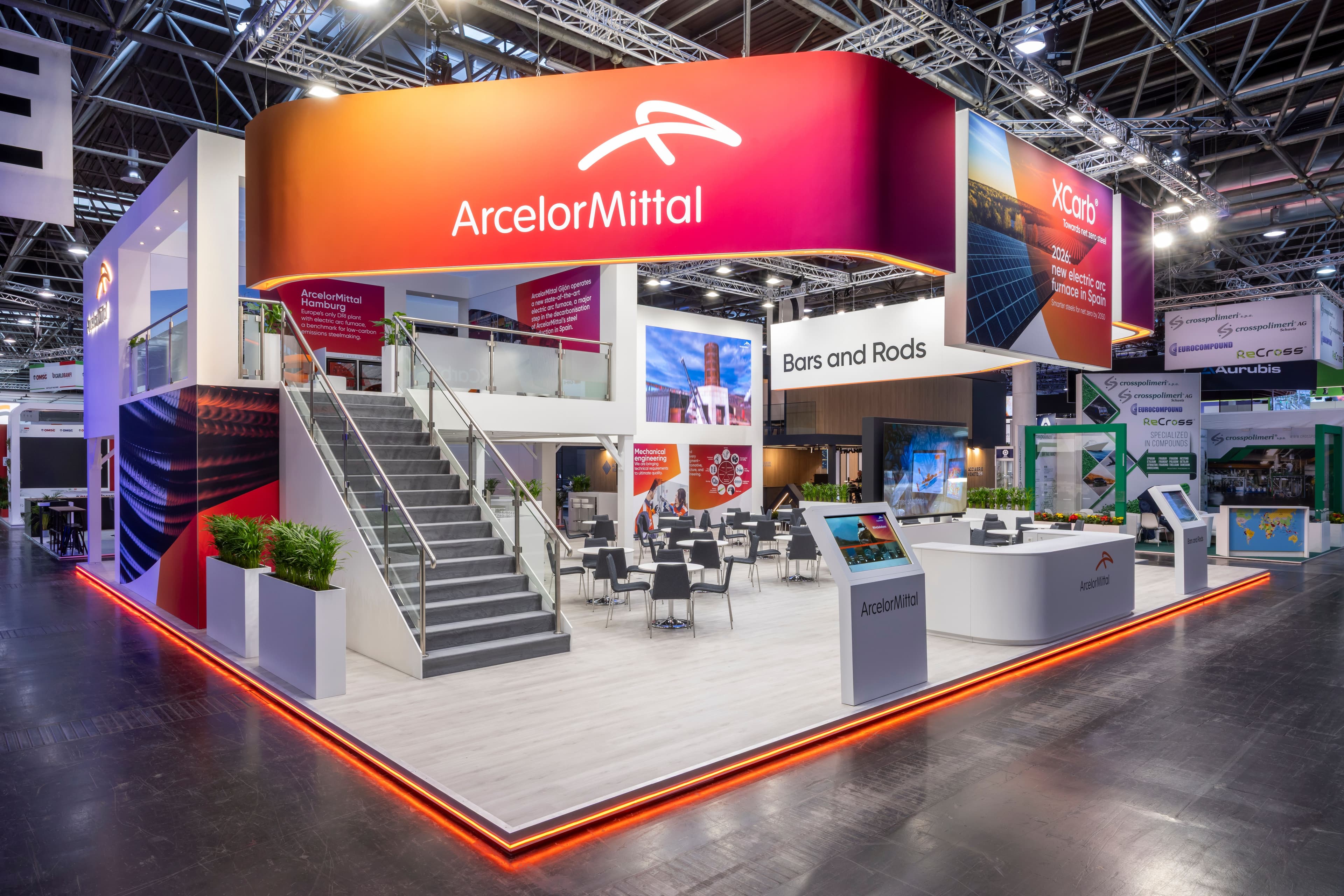 For an international trade fair, we created an innovative, multi-level stand that perfectly reflected ArcelorMittal’s technological character. With a mezzanine, striking design, and numerous digital applications, visitors were able to interactively explore the steel giant’s extensive range of products.